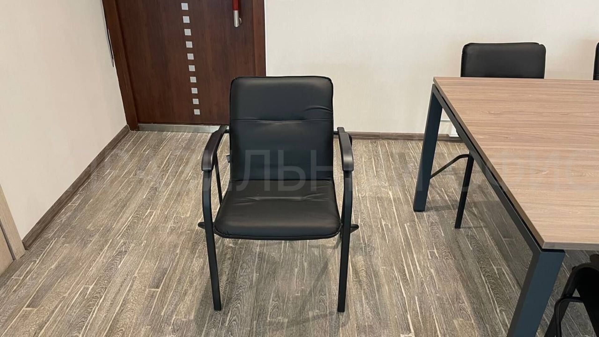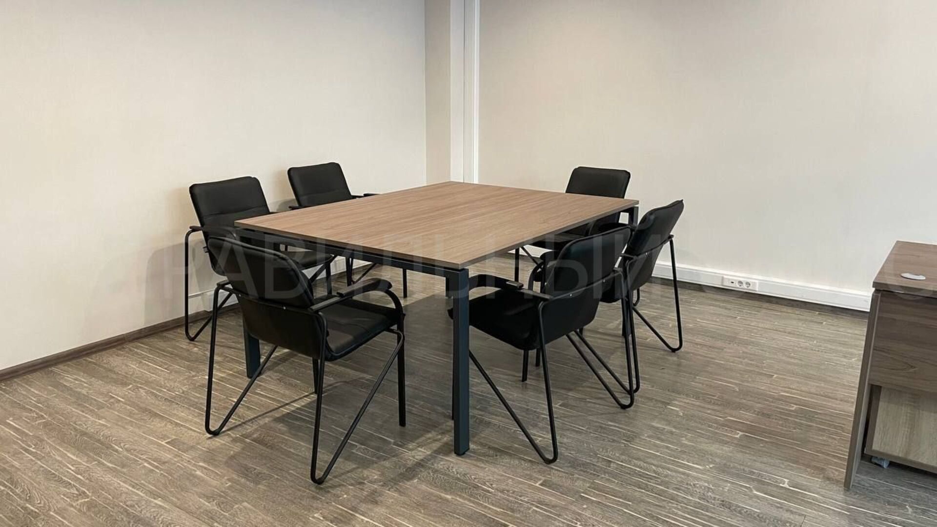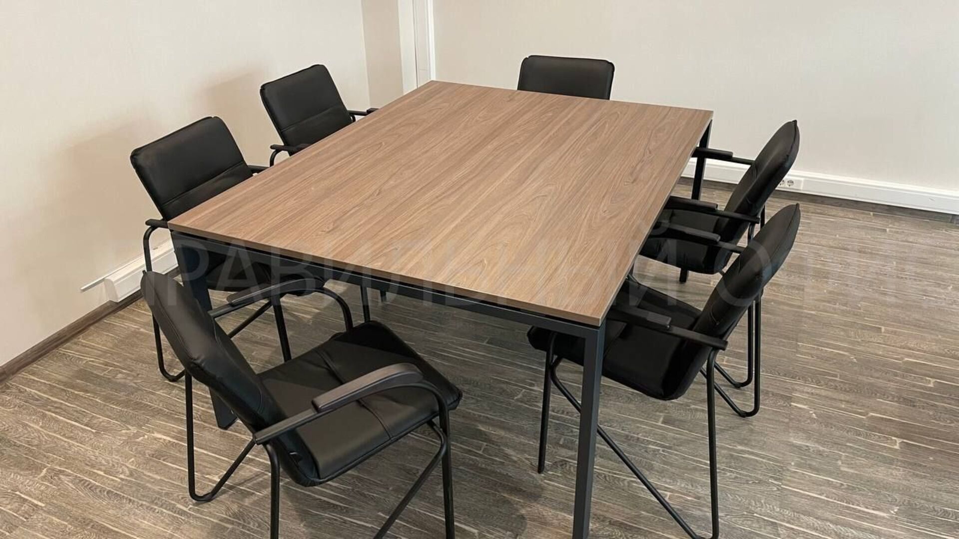 В зоне для переговоров был установлен переговорной стол из серии Metal System Direct на П-образном металлокаркасе в цвете Вяз Благородный/Антрацит.